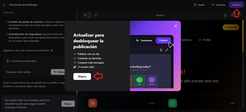 Al elegir tu plan, Hostinger te ofrece alojamiento gratis por 1 mes y 30 días para reembolso. Además, es la única plataforma donde puedes adquirir herramienta, hosting, dominio y correo corporativo en un solo lugar. Con tu plan activo y el proyecto finalizado, tu app estará en línea. Si hay errores, puedes corregirlos desde el chat. Puedes editar tu app en cualquier momento desde la plataforma.